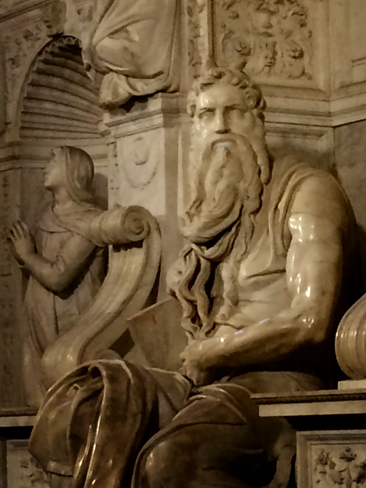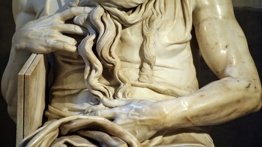 Para mí los detalles son impresionantes, su mano derecha acaricia su barba llevándola hacia un lado como si fuera natural. Observa detenidamente sus vestidos, ¡cada pliegue es tan real! Mira la caída que tienen sus ropas, sólo Miguel Ángel pudo haber creado esto a partir de un bloque rígido de mármol.