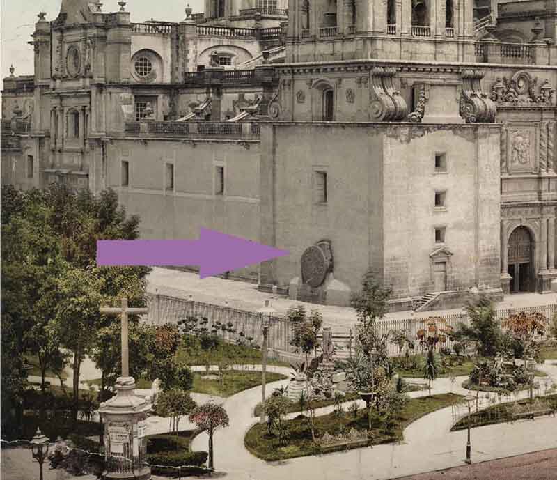 Además, se derribó o enterró al consumarse la Conquista de México y permaneció así hasta su hallazgo en el Zócalo, la plaza mayor de Ciudad de México, el 17 de diciembre de 1790. Fue colocada a un costado de la Catedral Metropolitana.